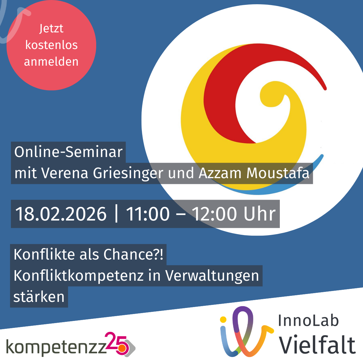 Kommunale Verwaltung als Innovationsraum für Vielfalt - Das InnoLab Vielfalt lädt ein zu seiner Online-Seminarreihe für kommunale Fach- und Führungskräfte. Den Start machen Verena Griesinger und Azzam Moustafa am 18.2. von 11 bis 12 Uhr mit dem Thema "Konflikte als Chance?! Konfliktkompetenz in Verwaltungen stärken". Wir freuen uns über Ihre Anmeldung!